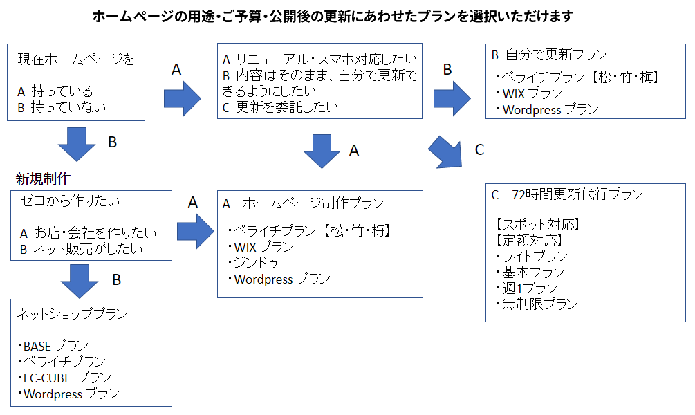 スタンダードホームページ制作プラン ホームページでこのような お悩みありませんか? 新しくホームページを立ち上げたい 会社を設立したばかりの経営者の方で、比較的小さなホームページ規模から始めたい ネットで商品を売りたい ホームページはあるけど、 作ったきりで何年も運用・更新ができていない ホームページをリニューアルして、WEB経由で問い合わせが来るようにしたい ホームページはあるけど、スマートフォンに対応していない 信頼性と営業機会をアップさせるホームページ制作 ホームページは、貴社の事業や商品、またサービスを宣伝する「24時間稼働する営業マン」として活動してくれます。 自社ホームページ内でブログなどを書き続けて行くと、検索やアクセスされる機会も多くなっていき、貴社の財産となっていきます。 また、ホームページ上に、「経営理念やビジョン」のコンテンツを設けることで、貴社がどのようなビジョンを社会に発信しているのかをユーザーは知ることが出来ますし、「自社の強み」で、貴社の製品や特徴、また会社の状況などを宣伝することも可能です。また「スタッフ紹介」で、一緒に働く社員やスタッフの人柄やタイプをユーザーに訴える事ができますので、求人の際に判断材料になる機会もあります。 将来性を見据えたホームページの重要性 初めてのホームページ制作で注意したいポイントは、一時的なニーズに応えられるホームページ制作では不十分となってしまうということです。流行のデザインや機能を取り入れることも、ユーザーの目を引くために重要ではありますが、必要なことはそれだけではありません。弊社は、様々なクライアント様とお仕事をさせて頂き、ホームページ制作のノウハウを築き、多くのクライアント様に信頼と実績を重ねて参りました。 企業の理念やビジョンを活かすホームページ制作 「将来性を見据えたホームページ制作」のために心がけていることは、貴社の「理念やビジョン」を活かすことです。貴社の製品やサービスを必要とされているお客様、また貴社が本来求めているターゲットを明確にしていきます。このようなワークショップやミーティングを通しながら、ホームページに導入する情報を精査し、制作へと繋げて参ります。